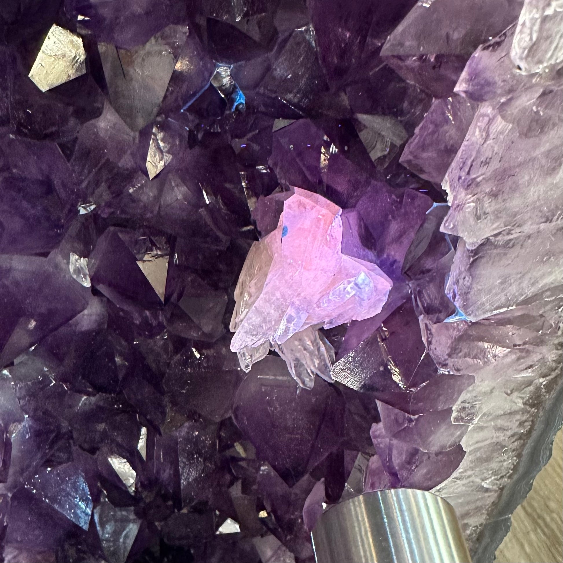 ドーム内のカルサイトは、ブラックライトに反応して、綺麗なピンク色に発光してとても綺麗です、粒の紫色が綺麗な特級品です