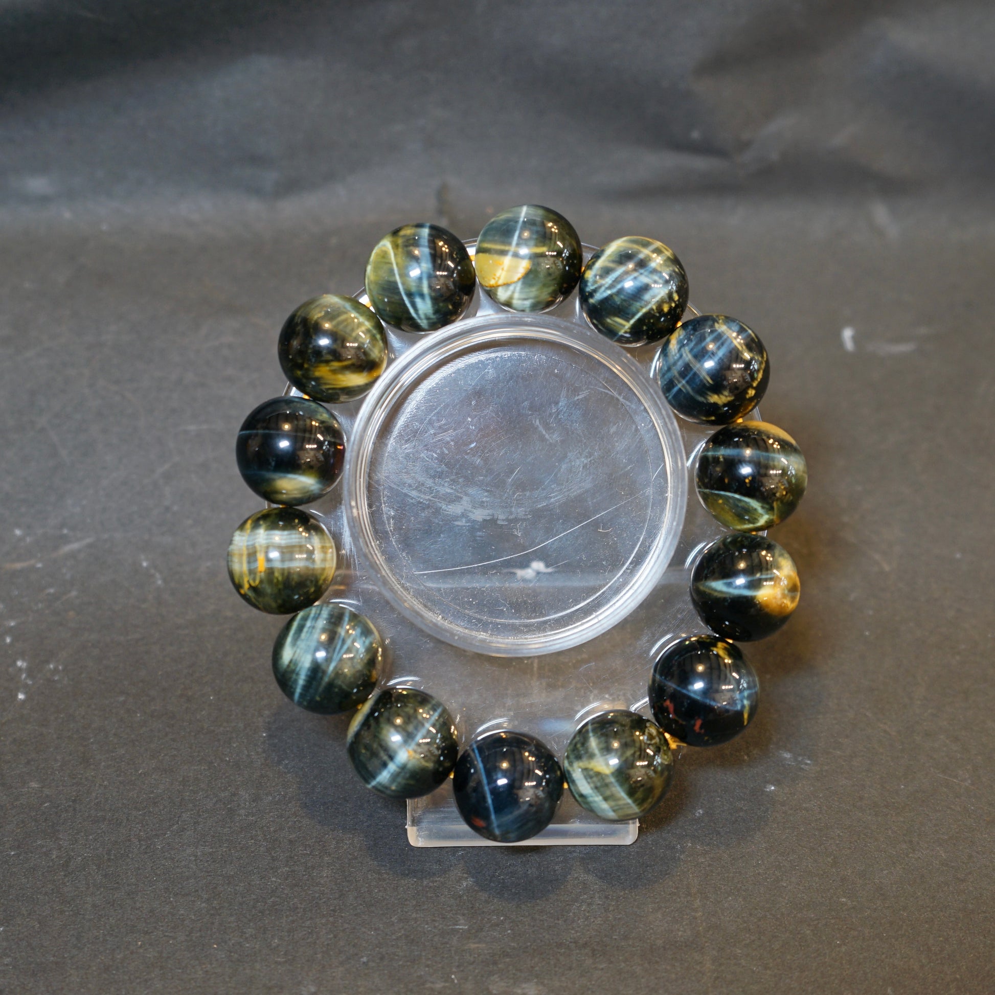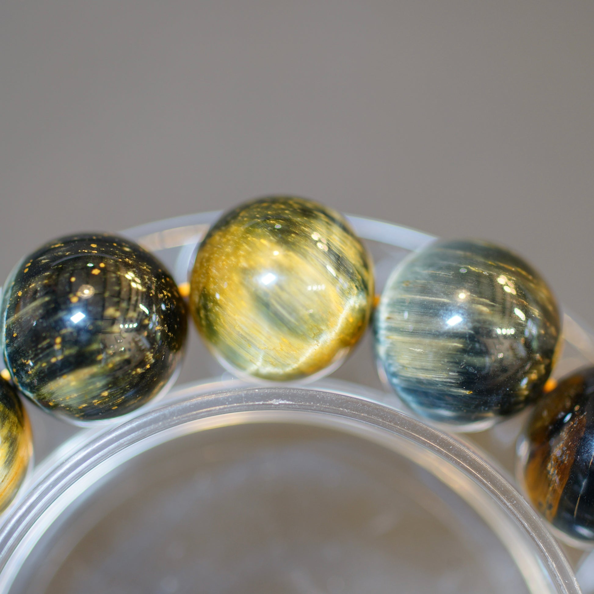 ビーズがブルータイガーアイとイエロータイガーアイに分かれているのとは違い、ブルーとイエローの2色が、シャトヤンシー効果で猫の目のように怪しく光ります、夜空に浮かぶ月の様とも呼ばれていますタイガーアイは、和名は虎目石と言い、虎の眼力と行動力を象徴する成功の石です